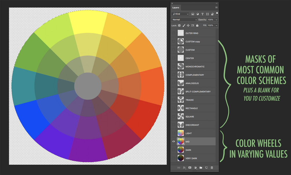 A simple layered PSD file I created to make color palettes. It has 4 color wheels ranging from Light to Very Dark and 8 masks: Monochromatic, Complementary, Analogous, Split-Complementary, Triadic, Rectangle, Square and Discordant. Just rotate the masks over the wheels to choose which color scheme you want. Watch a 2-minute rundown video on my YouTube channel that explain the file and how to use it; https://youtu.be/YqOSHHKgqVs.